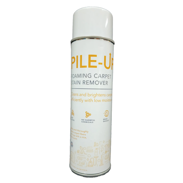 Pile-Up is a powerful carpet stain and spot remover. Contains strong cleaners to remove stains due to dirt, ink, mud, ketchup, urine, vomit, coffee, tea, alcoholic beverages and soft drinks. Upside-down spray valve allows easy application. Stream sprays concentrated product on spots and stains without heavy overspray. This product quickly saturates materials for instant cleaning. Leaves no residue. Contains no solvents which might soften carpet backings. This product also contains an odor modifier which destroys odor due to urine and vomit through oxidation catalysis.
